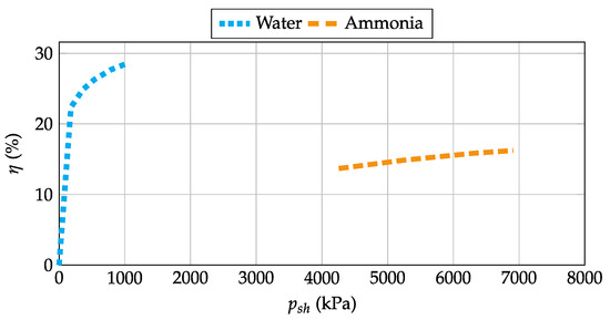 Figure 5 depicts the performance evolution considering water and ammonia as working fluids. In these cases, the quality of the fluids in state 6 is inside the saturation curve. Consequently, there are several super-heater pressures that cannot be used, as the quality of the fluid at the output of the turbine is under 90%. Ammonia can only work between kPa, with a maximum performance between 10 and 20%. In contrast, the ORC with water as the working fluid can have a performance up to 30%. Indeed, a performance in between % is reached with a super-heater pressure in the range kPa. Consequently, it can be considered as a working fluid of Group 1, following the categorization previously proposed and analyzed. The main difference between water and the working fluids included in Group 1 is the output temperature of the super-heater (), which is 650 K for water, around 200 K over the range of the working fluids included in Group 1 ( K).