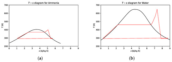 Figure 6, Figure 7 and Figure 8 show the T–s diagrams for working fluid Groups 1 and 2, Groups 3 and 4, and ammonia and water, respectively. Only the real ORCs are presented for the sake of clarity. Note that the same X () and Y () axis limits are considered in the three figures, in order to ease the comprehension of the diagrams. With these figures, it is easy to understand the four groups previously defined, as they have similar T–s diagrams and similar differences between the super-heater pressure and the condenser pressure, which, in fact, causes the similar behavior of the performance of the ORC with fluids of the same group, as shown in Figure 4. In addition, an important difference between the T–s diagram of the organic fluids and those of water and ammonia can be seen, not only because of the higher temperatures and entropies of water and ammonia, but also because of the symmetry of the saturation curve in these two fluids. Together with this, Figure 8 also depicts the fact that state 6 for both ammonia and water lies inside the saturation curve, whereas it is outside for the other organic working fluids (refer to Figure 6 and Figure 7).