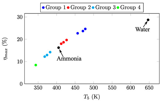 In Figure 9 the maximum performance of the ORC depending on the fluid and the output super-heater temperature is presented. Organic fluids are grouped according to the classification proposed from Figure 4. Considering this figure, ammonia could be included in Group 2, as the output super-heater temperature is within the range specified for such group ( K) and similar maximum performance of the ORC () is obtained. However, its super-heater pressure to reach that maximum performance is nearly 7000 kPa, which is twice the value of the super-heater pressure needed in the organic fluids of Group 2 to obtain a similar maximum performance.