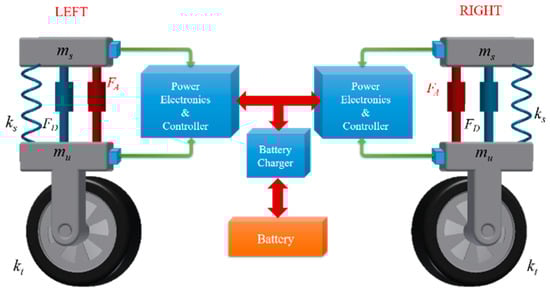 - Gysen, B.L.J.; Van Der Sande, T.P.J.; Paulides, J.J.H.; Lomonova, E.A. Efficiency of a Regenerative Direct-Drive Electromagnetic Active Suspension. IEEE Trans. Veh. Technol. 2011, 60, 1384–1393. [Google Scholar] [CrossRef]