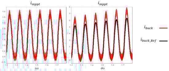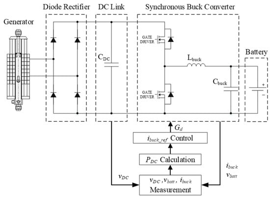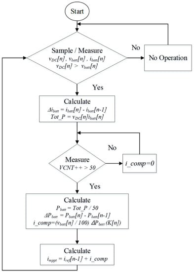 In this algorithm, the synchronous buck converter current is perturbed to track the maximum output power. The reciprocal of the battery voltage, which is shown at Equation (8), is determined as the magnitude of the perturbation constant, which is determined as the reference current by multiplying the total power change. A fixed step size was not used as the perturbation constant. It should be noted that the proposed algorithm uses the rate of change of the synchronous buck converter current owing to the relatively fixed battery voltage. The DC link and battery voltage were determined as sampling standards. The duty cycle is reflected by DC link voltage divided by the output voltage. The validity of the designed energy-harvesting system was performed using PLECS version 4.4 simulation tool and the overall active power converter of structure is shown in Figure 4 with the MPPT algorithm.