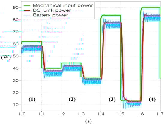 The proposed algorithm simulation result of the current variation under the discrete torque is compared with the fixed step size as shown in Figure 5. It was confirmed that the proposed step size is suitable for the fluctuation of the perturbation current as shown in Figure 5a. However, the fixed step size of conventional P&O MPPT algorithm shows unstable results under rapidly varying torque conditions in Figure 5b. Figure 6 shows the power of the mechanical input, DC link, and battery using the proposed P&O MPPT algorithm with the optimized coefficient value. The mechanical input torque was randomly applied from 0.1 Nm to 1 Nm to simulate irregular rough road conditions.