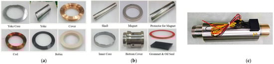 The components of the linear generator are largely composed of a stator assembly and a mover assembly. The detailed components of the stator assembly are composed of a core, coil, cover, yoke, and bobbin. The detailed components of the mover assembly are composed of a magnet, spacer, magnet protective cover, permanent magnet, and shaft. In addition, a plastic grommet was developed to protect the coil when the coil was drawn out, and an oil seal was developed to prevent oil leakage. The peak-to-peak stroke length of the designed generator is 12 mm. The overall assembly of the components and final prototype are shown in Figure 7.