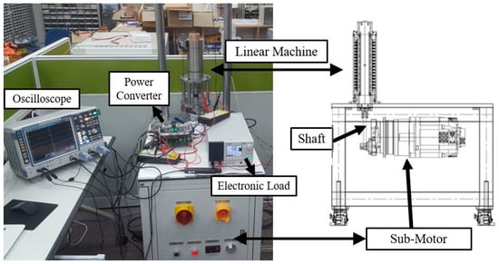 The test setup comprised a power converter, a linear machine, an oscilloscope, and an electronic load. Based on the modeling described in the previous section, the output of the generator for each vibration speed and the output of the power converter were compared considering the irregular road conditions and driving speed. It should be noted that to generate the vibrating motion, the moving part and PM layer are connected to the sub-motor by a shaft. The rated speed of the sub motor was 1500 r/min, the maximum speed was 3000 r/min, and the gear ratio of the linear machine and sub motor was 1:5. Under these conditions, the vibration speed of 0.25 m/s is the same speed as the 2813.5 r/min rotational speed, which almost reaches the maximum possible rotational speed of the sub-motor. Considering these characteristics, the vibration speed was performed in the range of 0.1–0.25 m/s. The environment of the test setup is illustrated in Figure 9.