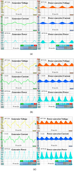 The waveform of the performance evaluation using vertical excitation for the energy-harvesting linear generator is shown in Figure 10. Based on the maximum vibration speed, the maximum and average powers of the generator were approximately 225 W and 69 W, respectively, which were slightly lower than the design target. The differences and errors during the manufacturing process affect the generator performance. The maximum and average power outputs of the power converter were approximately 200 W and 63 W, respectively. The efficiency of the power converter is expressed as the ratio between the converter and the linear machine output power as shown in Equation (14). The efficiency of the maximum vibration speed section was 91.6%, and the efficiency of the entire section is listed in Table 3.