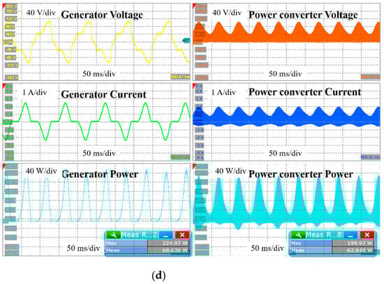 Linear generator and power converter output characteristic waveform by vibration speed: (a) 0.1 m/s; (b) 0.15 m/s; (c) 0.2 m/s; (d) 0.25 m/s.