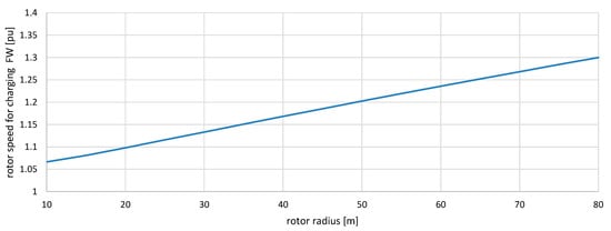 The initial design of the FW applied deliberate overspeed of the rotor for charging the FW with centrifugal forces only [7,8,9]. However, this methodology is only feasible for small WTs, as the required overspeed increases with increasing rotor diameter. Figure 2 illustrates that the required overspeeds for charging with centrifugal forces are well beyond the normal speed range of state-of-the-art multi-megawatt (MW) WTs. Hence, the FW system comprises electrically driven pumps for charging the FW (Figure 1) at any arbitrary rotor speed [11]. Although the need for electrically driven pumps adds complexity to the system and seems to be a disadvantage, it is actually an advantage in two respects: (i) The FW can be charged and discharged at any operating point of the WT, and the transition from charging to discharging and vice versa can take place within seconds. (ii) The electric power that is consumed by the pumps adds to the torque in the generator of the WT. Therefore, the pumps are additional actuators in the controls of the generator torque.