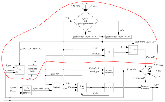 Simplified block diagram of the power control circuit of the WT with FW system. The red encircled part is the feed forward control.