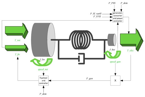 Figure 4 illustrates that T_fw is measured and fed forward to the power controller of the frequency converter, where it is turned into a power offset that is extracted from the generator. This is different from the original power control as published in the model documentation [13]. Hence, T_fw acts simultaneously on the driving end of the drive train (the WT rotor) and on the output end of the drive train (the generator). The advantage of this feed forward control is twofold: (i) The power from the FW can be provided much faster, i.e., without having to overcome the inertias in the drive train first; (ii) the drive train remains in a steadier operating point, because the flexibility of the drive train (illustrated in Figure 4) is less excited to vibrations with every change in T_fw.