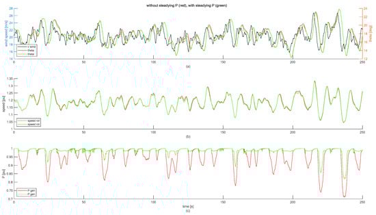 In the study at hand, P_PSS is realized with the FW in the WT. The FW is particularly handy for this purpose because it allowed for periodic energy storage and release without much impact on the rotational speed. The alternative to using the FW would be to use the kinetic energy stored in the WT drive train, which would invariably lead to noticeable speed excursions. Also for PSS, the feed forward control is applied. It mitigates transients in the loading of the drive train, because also here it varies the power on the rotor end and on the generator end simultaneously, as seen in Figure 4. Since the kinetic energy used for PSS is not taken from the rotation of the drive train, there is also hardly any impact on the rotor speed, and, hence, on the aerodynamics and consequently on the energy yield of the WT, as seen in Figure 11.