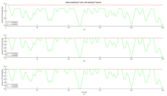The simulations conducted in this paper are all done with an imbalance in the rotor: The inertia of blade 1 is 1.37% larger than the inertia of blade 2 and blade 3. This imbalance leads to asymmetric centrifugal forces, which cause lateral deflections of the WT tower. The scenario shown in Section 3.1 and Section 4.1 are again taken here to show the effect of this rotor imbalance. When the WT steadies the power infeed with the FW, the FW starts with striving for the state of charge ratio, which levels out the imbalance in the rotor, as seen in Figure 16. The effect is visible in Figure 16, which shows that the lateral tower vibrations decrease with time when the FW levels out the imbalance, while they increase if the imbalance remains in the rotor.