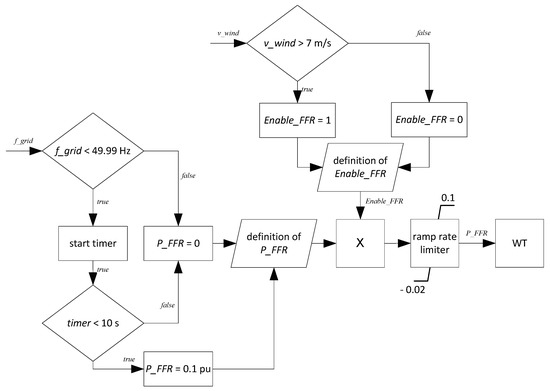 Hydro Quebec demands WTs to inject a minimum power for a minimum duration and with minimum ramp rates if the grid frequency drops below a certain threshold. However, FFR operation is only demanded in case of sufficient wind speed [22]. The FFR controller applied here exceeds all minimum requirements as stipulated by Hydro Quebec, see Figure 7. This type of FFR is most suitable for generators with small energy storages, such as a WT which can access its kinetic energy in the drive train, or even better, a WT with a FW in its rotor.