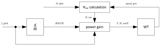 In this study, the previously proposed variable inertia constant (Hvar) controller is applied [25]. The Hvar controller takes the needs of a variable speed WT and the needs of the grid into account. On the one hand, a WT is bound to be exposed to varying wind speeds; on the other hand, the grid requires reliable inertia provision. The Hvar controller ensures reliable inertia provision by the WT even in case of turbulent wind. However, to consider the worst-case scenario for the stress on the WT, the facility for preventing excessive vibrations caused by the Hvar controller is omitted [26]. Hence, the Hvar controller depicted in Figure 8 results.