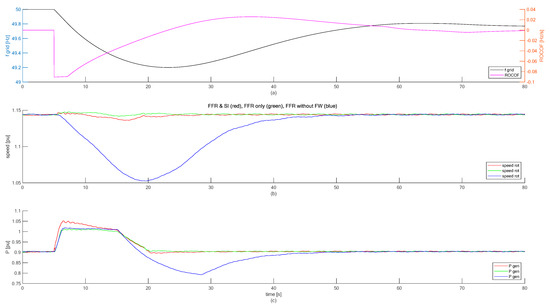 Simulation of WT operation providing the grid with FFR and SI in response to the ENTSO-E reference incidence. (a) Grid frequency and ROCOF. (b) Rotor speed. (c) Generator power.
