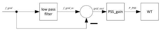 Figure 10 shows that the power offset for damping grid oscillations, P_PSS, is derived from the difference between the instantaneous f_grid and its steady state value, f_grid_ss, around which it oscillates, see Equation (4).