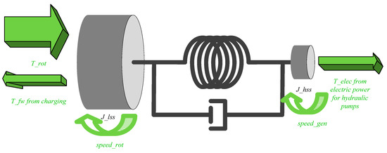 The FW in the rotor of a WT can also absorb energy during LVRT; however, it can do so even on both ends of the drive train. While the FW is charged, the Coriolis forces that arise from moving the fluid mass to a larger radius cause a decelerating torque in the rotor blades. However, since charging is accomplished with motor-driven pumps, the power that these pumps absorb has to be produced by the generator. Hence, although the generator cannot feed power into the grid, it can produce some decelerating torque from the electric power that it provides for the pumps. Figure 12 shows, again, the schematic of the drive train. It shows how the FW torque, T_fw, and the electric torque, T_elec, caused by the pumps in the generator, mitigate the acceleration of the WT drive train.