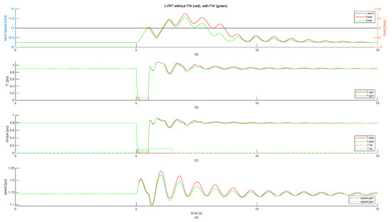 To illustrate the behavior of the WT with FW, Figure 13 shows a simulation of a voltage drop that leads to zero active power in all three phases and that lasts for 500 ms [34].