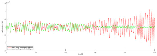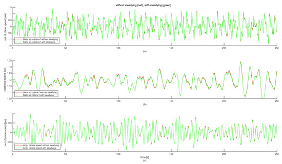 In the scenario in Section 3.1, the WT steadied its power infeed with the FW, which, at the same time, also steadied the operation of the whole WT. Hence, in addition to the signals shown in Figure 5 and Figure 6, Figure 14a shows the out-of-plane speed of the tip section of exemplary blade 1. The out-of-plane speed is a measure for the changes in the operating point, which constitutes itself in changes in the aerodynamic thrust. The same reasoning applies to the longitudinal speed of the nacelle (tower head), which is shown in Figure 14c. Finally, Figure 14b shows the in-plane speed of the tip section of exemplary blade 1, which can be compared to the rotor speed signal in Figure 5.