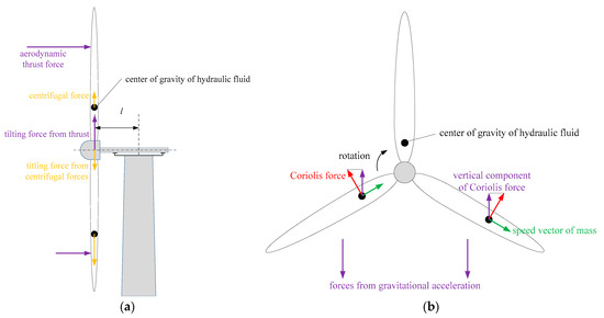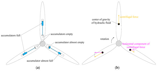 Figure 1 shows that the FW system consists of at least two hydraulic–pneumatic piston accumulators in each rotor blade of the WT. The fluid in these piston accumulators has a certain mass. By relocating the fluid with its mass from the piston accumulator in the blade root, Figure 1a, to the piston accumulator, which is closer to the blade tip, Figure 1b, the inertia of the rotor blade is increased [7,8].