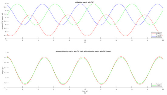 Continuous asymmetric operation of the FW to mitigate the gravitational forces that lead to the torques which act on the blade roots. (a) Centre of gravity of FW fluid in the three blades. (b) Blade root torque of blade 2.