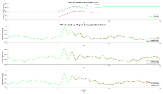 The FW can also be used for damping in-plane vibrations of the WT tower or of individual rotor blades. Also here the FW has to be controlled in a way that the Coriolis forces either counteract the lateral motion of the tower, or the in-plane motion of one rotor blade. To show an example, the latter case is considered: The LVRT simulation shown in Figure 13 also led to strong in-plane vibrations of the rotor blades. Figure 19 shows the scenario again, once with mitigating the acceleration only (as discussed in Section 3.4), and once where in addition also the in-plane vibrations of the blades are damped.