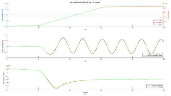 For the purpose of testing the functionalities, a part-load operating point of the WT is considered. Full load is less interesting, as there the wind speed usually contains sufficient kinetic energy; hence, the FW is not needed for producing extra power. To have a realistic test case, the reference incident as defined by the European Network of Transmission System Operators for Electricity (ENTSO-E) [27] is chosen, as seen in Figure 9a. To improve comprehensibility, the scenario shown in Figure 9 considers a non-turbulent constant wind speed of 11 m/s.