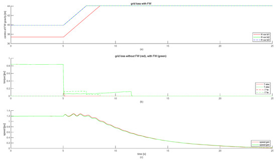 Emergency braking after grid loss. Effect on the drive train of the WT, with and without the support of the FW. (a) Centre of gravity of FW fluid in the three blades. (b) Generator torque and negated FW torque. (c) Generator speed.