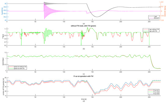 Figure 9 shows clearly that the FW prevents large excursions in the rotational speed. Hence, the recovery phase, which is clearly visible in the case of FFR without FW, can be avoided. The recovery phase is particularly disturbing for the grid, as it deprives the grid of power in a situation when it is in desperate need of extra power. The demanded inertia constant for the Hvar controller is set to Hdem = 12 s, as in previous studies [26].