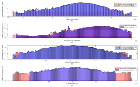 The stress on the mechanical structure of the WT is assessed with the histograms of some selected mechanical quantities in Figure 23. When considering the stress on the WT, most emphasis should be put on the tower and the rotor blades, as these are the most expensive components of a WT [19]. For each signal, Figure 23 compares the operation of the WT in the test scenario without FW (red) and with the FW (blue).