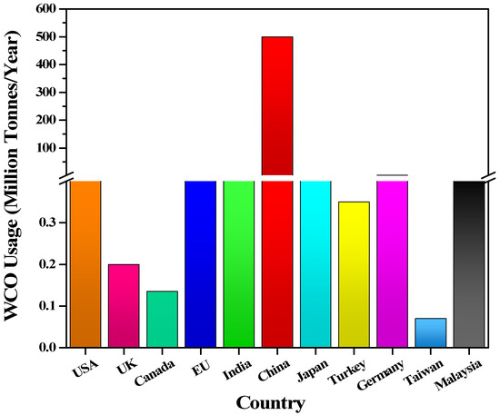 - WCO is a potential source and widely available in the world for producing biodiesel through transesterification.