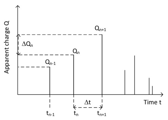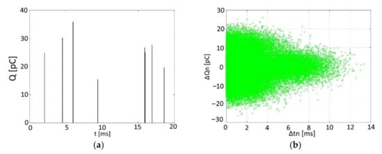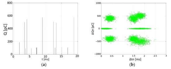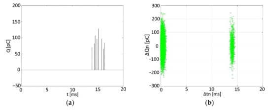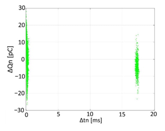 Figure 11) shows the behaviour of ideal measurement with a low repetition rate of partial discharges and ideal noise filtration. This simulation has pulses of two charge levels and different time delays with added deviation for both parameters. Simulated Q-t PSA has a similar shape and structure as the real measurement. The differences in ΔQn and in the time delay are possibly caused by a lower repetition rate with no added noise. Values of ΔQn are different because of the input values of the simulation; nonetheless, it does not affect the Q-t PSA clusters’ position or the shape.