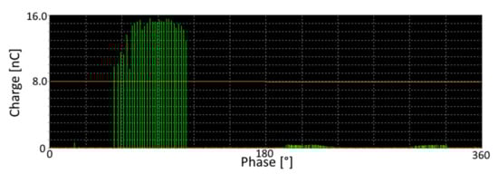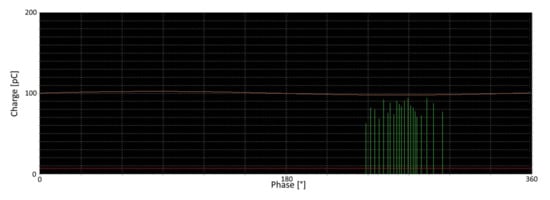 Figure 19. The plot for 3.5 kV consists of three pairs of symmetrical lines around the central cluster—the first pair is in ±15 pC, the second is in ±25 pC, and the third is in ±50 pC. Pulses with the highest repetition rate (