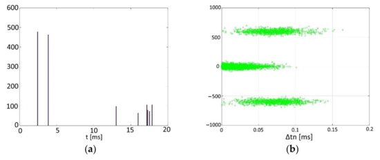 Figure 10) is created by the difference between the last streamer impulse and the first Trichels pulse (high pulse to low pulse). All the clusters are in a narrow band of Δt due to the high repetition rate of the discharge activity or noise—the upper and the lower clusters are in the range from 0.025 to 0.1 ms, and the central cluster is in the range from 0.025 to 0.15 ms. The gap in Δt = 0–0.025 ms is caused by a distinguishing ability of the measurement system. This presumption is based on the knowledge gathered from the simulation of Q-t PSA creation shown in
