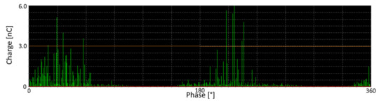 PRPD analysis is the most common graphic method to represent AC partial discharges. However, PRPD is not suitable for direct current due to the absence of the voltage phase. Despite the graphical representation of the PD, values as apparent charge, charge count and time of the discharge occurrence are still the most important criteria of the PD measurement [