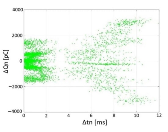 Figure 16 represent AC internal PD activity. The cluster displayed on Q-t PSA from Δtn = 0–3 ms and ΔQn = −1000–1000 pC and the cluster on the Q-t PSA coordinates from Δtn = 4–12 ms, and ΔQn = −3500–3500 pC have a similar shape (left-side oriented triangle with a line on ΔQn = 0 pC) but in a different scale. There are two more horizontal lines around ΔQn = ±1500 pC; Δtn = 0–3 ms.