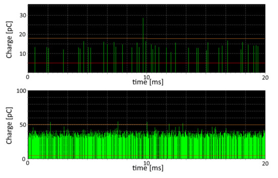 Figure 8) confirms the behaviour of the real measurement Q-t PSA. This simulation has pulses of one charge level and different time delays with added deviation for both parameters. There are only two clusters of similar ΔQ