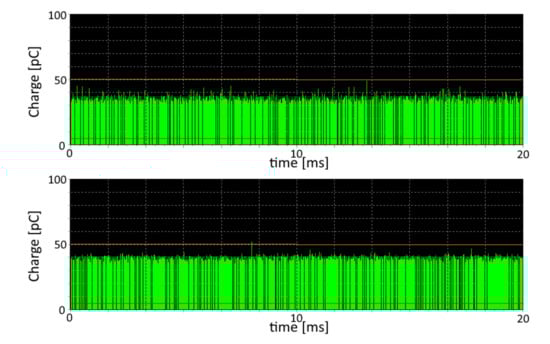 Figure 18 shows pulse diagrams of measured DCN corona at 3.5 kV; 5 kV; 5.5 kV; and 6 kV voltage levels. Charge values for 3.5 kV were in the range of 10 to 17 pC. Pulse repetition rate extensively increased, and a majority of the pulses moved to the range of 30 to 40 pC at the 5 kV voltage level. The next voltage increments just raised charge values closer to 40 pC. From the pulse diagrams in