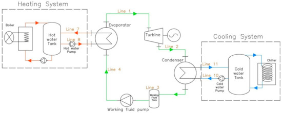 The Rankine system operates with CC; R-152a at compressed liquid state is transported by the pump to the evaporator, where the working fluid is evaporated into a saturated vapor state by warm water from the heating system. Then, the vapor drives the turbine and the connected electrical generator to produce 1 kW of electricity. The mixture vapor from the turbine is condensed into saturated liquid state in the condenser, and then the saturated liquid of the working fluid is transported by the pump to the evaporator to begin the cycle again.
