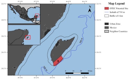 Figure 2). In this area, 700 m isobath is located at 4 km of the coast, and it is around 20 km away from the nearest population center. Cozumel has been assessed for OTEC prospection since 2007 [