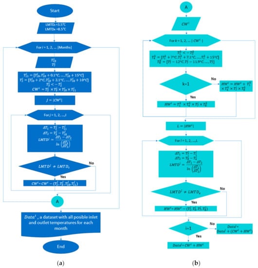 In this sense, inlet and outlet temperature combination with a > 3.7 kg/s and > 2.8 kg/s were removed, as well as those combinations where was higher than . Then, from the rest of inlet and outlet temperatures combinations, the one with the highest was selected. This evaluation and selection were set for each month and for each estimation model.
