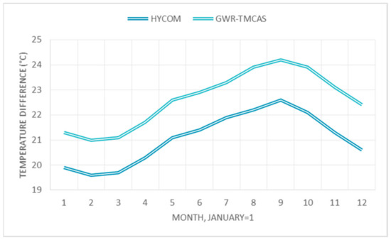 T10) mean temperatures for each month in the study area. In general, it is evident that GWR-TMCAS estimated a larger temperature difference than HYCOM every month. Nevertheless, the minimum and temperature difference occurs in February for both models, with a value of 19.6 °C for HYCOM and 21.0 °C for GWR-TMCAS. Similar to minimum temperature difference, the maximum temperature difference is presented in the same month for both models: temperature difference in October reaches 22.6 °C for HYCOM, while GWR-TMCAS reaches 24.2 °C.