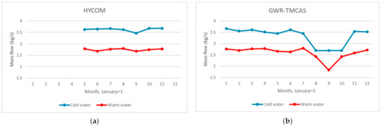 Figure 6 in certain months such as August in GWR-TMCAS. Nevertheless, it is not evident for all months: this behavior can be caused by the OTEC-CC-MX-1 kWe water pump limits and by optimization of inlet and outlet temperatures.