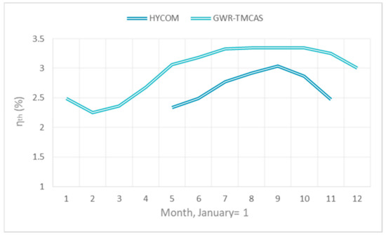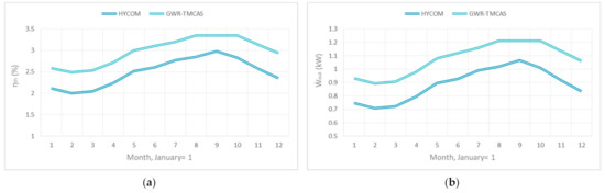 has an inverse relationship with temperature difference. In the case of HYCOM, there are no data available for January, February, March, April, and December, due to the temperature difference estimated for this model in these months not being enough to provide 1 kW of