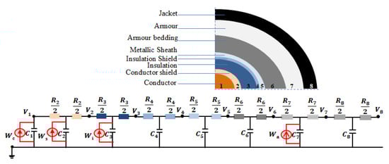 Detailed representations are possible for the equivalent circuit that models the cable in its operational conditions. These representations are formulated for the internal part of the cable and for the outer part that includes the soil and the external ambient. Figure 2 [] represents the single core of the cable, which has cylindrical symmetry and includes isothermal coaxial layers. The equivalent circuit contains a number of interconnected elements (capacitors, resistors, and generators).
