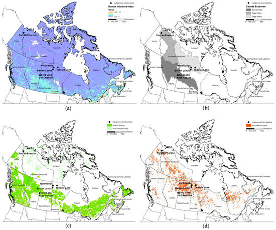 Map of Indigenous communities, including: (a) the human influence index for Canada, which is shown to illustrate the remoteness of the communities where red indicates highly developed areas [25]; (b) Canada’s ecozones in the study area [26]; (c) Canada’s forest tenures and First Nation Forests [27]; (d) burned areas (1986–2019) [28]. First Nations Forests are classified as treaty settlement lands, which includes non-forested and forested lands. Most of the communities do not have access to forest tenures and some of them (Manitoba) use salvaged fire residues to supply their boiler.