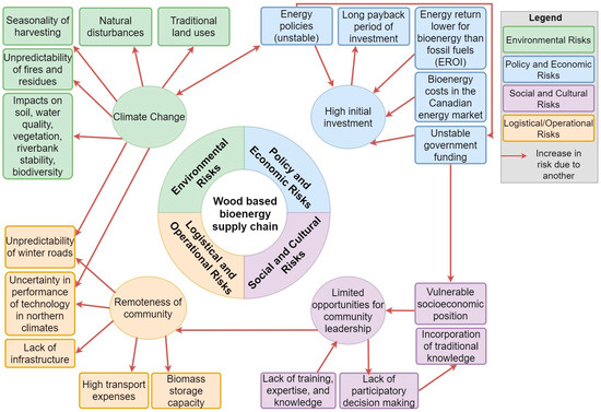 Risks and barriers to wood-based bioenergy projects in remote and Indigenous communities. Colour is used to represent the category of risk. The impact of one risk on another have been incorporated as arrows. The main drivers in each risk category are included in circles.