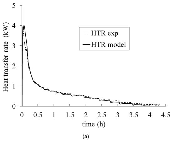 Figure 5 presents the outlet temperature and HTR of the HTF (Equation (11)), respectively, for both experimental and numerical results. As shown in the figures, there is a good match between experimental and simulated profiles for both the HTF outlet temperature and HTR. In the early period of melting, the model predicted slightly higher values of HTF than those obtained from the experiment. The temperature of PCM slabs and HTF were initially at around 5 °C. However, the vertical column of HTF at the outlet of the tank could still have some nodes at a slightly higher temperature (just 3 sensors were placed in the vertical column of water). This may be the reason for that disagreement. On the other hand, at the end of the experiment, the model predicted lower values of heat transfer rate. This is probably because at that stage, the PCM temperatures were above ambient temperature, and the PCM tank was absorbing a small amount of energy from the ambient. Neglecting the early period of the charging process, when the error was considerably higher, the error between the numerical model results and the experimental values was ±1%.