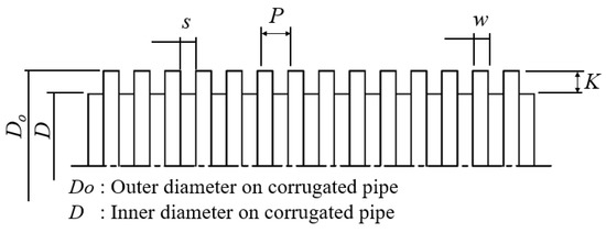 Figure 1 and Table 1 represent geometrics and parameters of the corrugated pipe for this study, where w is the groove length, K is the groove height, P is the groove pitch, and s is the distance between the grooves. Cases 1 to 3 are for the effects of groove height, and Cases 3 to 5 are for the effects of groove pitch.