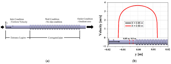 Since the inlet condition is given as uniform velocity, it is necessary to check whether the flows are fully developed before entering the corrugated pipe. The velocity distribution was compared at 0.85 m and 0.9 m in the x-direction from the pipe inlet. Figure 2 shows that the velocity distributions are no different. Thus, the fully developed flow is confirmed. Figure 2 contains the information on the boundary conditions of the corrugated pipe. The wall no-slip condition on the wall is applied. Since corrugated pipes are mainly used for pipe connection, zero gradients conditions are set at the outlet. The SIMPLE algorithm was used to solve the pressure and velocity coupling problem, and convergence judgment was set to 10−4 as the residual.