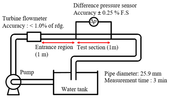The numerical analysis was validated by comparison with the experimental results. The experimental apparatus is shown in Figure 5. A turbine flowmeter was used, and a pipe length of 1 m was installed on the front of the test section, to ensure a fully developed flow before entering the test section.